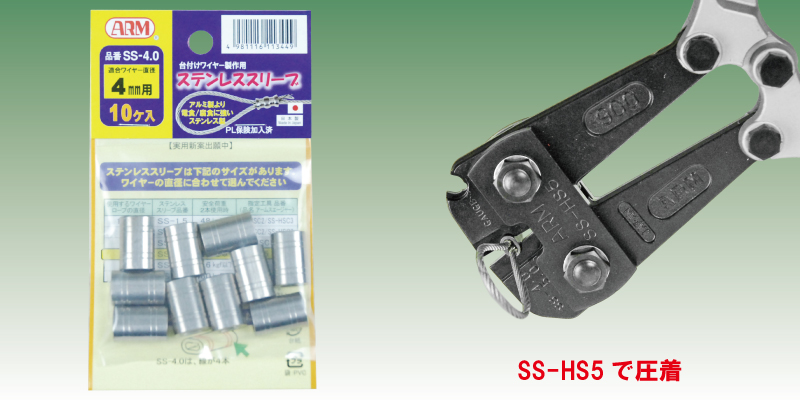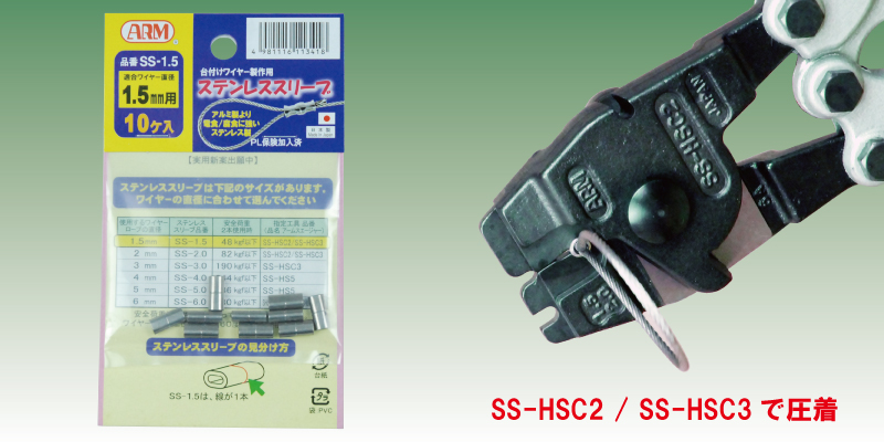 ・ARM-brand sleeves and swagers are designed and manufactured to be used together. (ARM Stainless Sleeve Swagers are for ARM Stainless Sleeve only. ・We will not guarantee the use of ther (non-ARM)brand sleeves/swagers with our products, and strongly advise against it. ・Refer t the specific sleeve technical data for detailed information relating to safety / destruction load. ・When swaging vinyle-sheathed wire rope, always retract sheathing to reveal wire rope before proceeding to swage. Otherwise, hanging strength can not be guaranteed. |