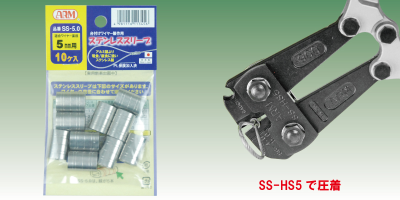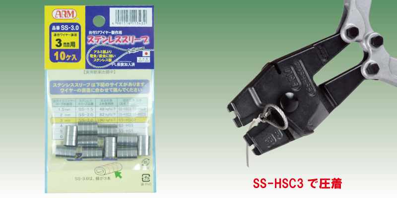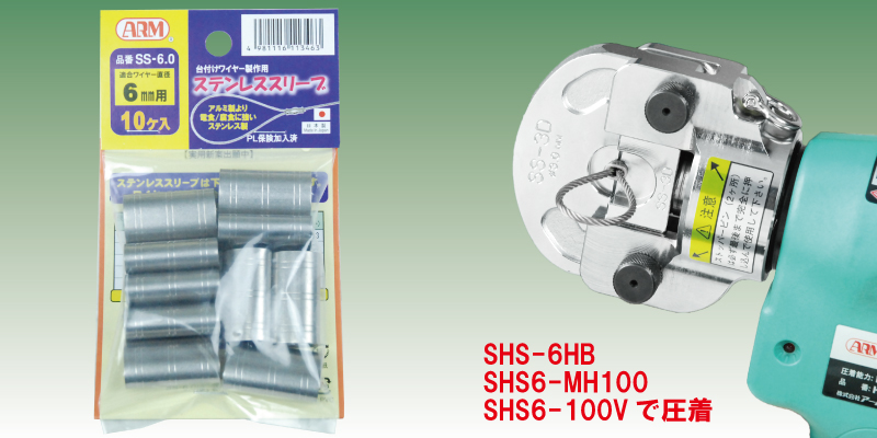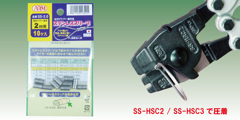 ・ARM-brand sleeves and swagers are designed and manufactured to be used together. (ARM Stainless Sleeve Swagers are for ARM Stainless Sleeve only. ・We will not guarantee the use of ther (non-ARM)brand sleeves/swagers with our products, and strongly advise against it. ・Refer t the specific sleeve technical data for detailed information relating to safety / destruction load. ・When swaging vinyle-sheathed wire rope, always retract sheathing to reveal wire rope before proceeding to swage. Otherwise, hanging strength can not be guaranteed. |